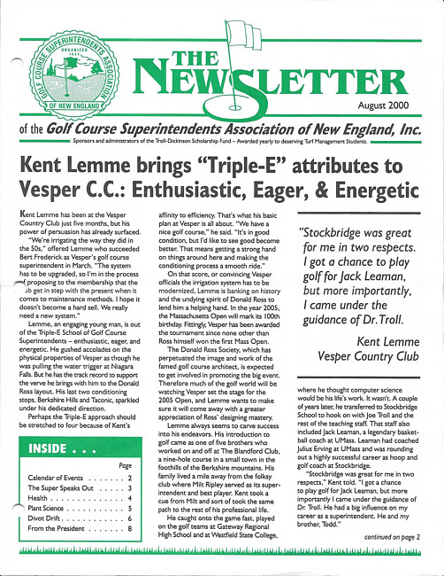 The newsletter of the Golf Course Superintendents Association of New England, Inc. (2000 August)