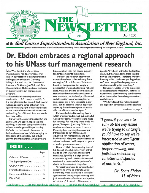 The newsletter of the Golf Course Superintendents Association of New England, Inc. (2001 April)