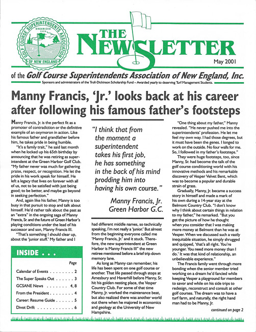 The newsletter of the Golf Course Superintendents Association of New England, Inc. (2001 May)
