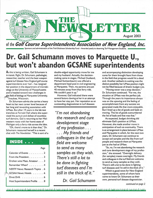 The newsletter of the Golf Course Superintendents Association of New England, Inc. (2003 August)
