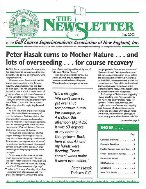 The newsletter of the Golf Course Superintendents Association of New England, Inc. (2003 May)