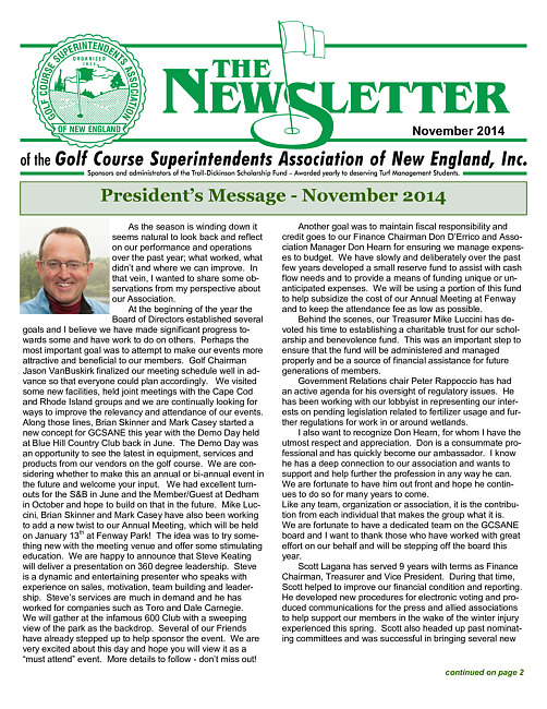 The newsletter of the Golf Course Superintendents Association of New England, Inc. (2014 November)