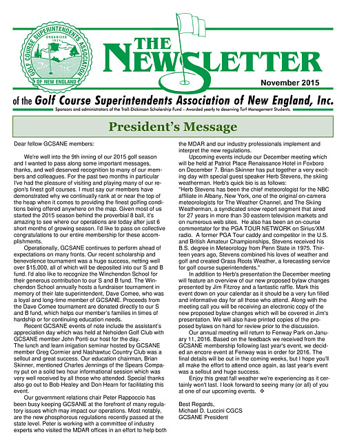 The newsletter of the Golf Course Superintendents Association of New England, Inc. (2015 November)
