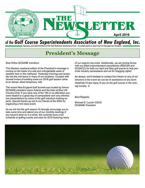 The newsletter of the Golf Course Superintendents Association of New England, Inc. (2016 April)