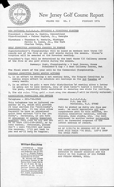 New Jersey golf course report. Vol. 7 no. 2 (1974 February)