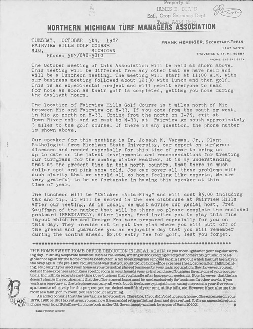 Northern Michigan Turf Managers Association newsletter. (1982 October)