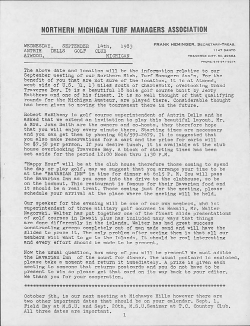 Northern Michigan Turf Managers Association newsletter. (1983 September)