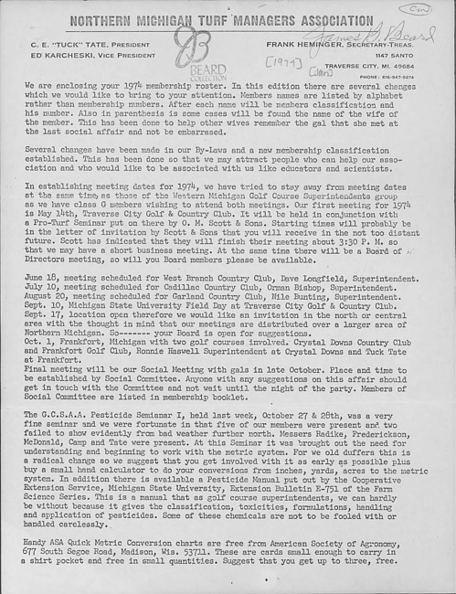 Northern Michigan Turf Managers Association newsletter. (1974 January)