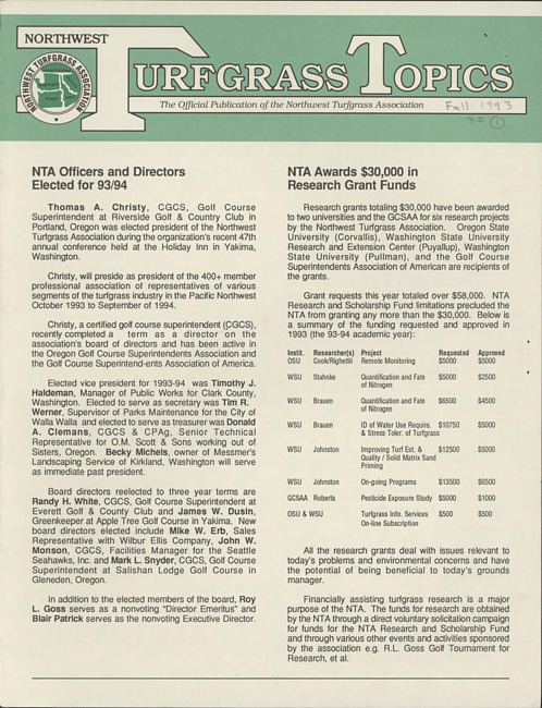 Northwest turfgrass topics. Vol. 37 no. 1 (1993 Fall)