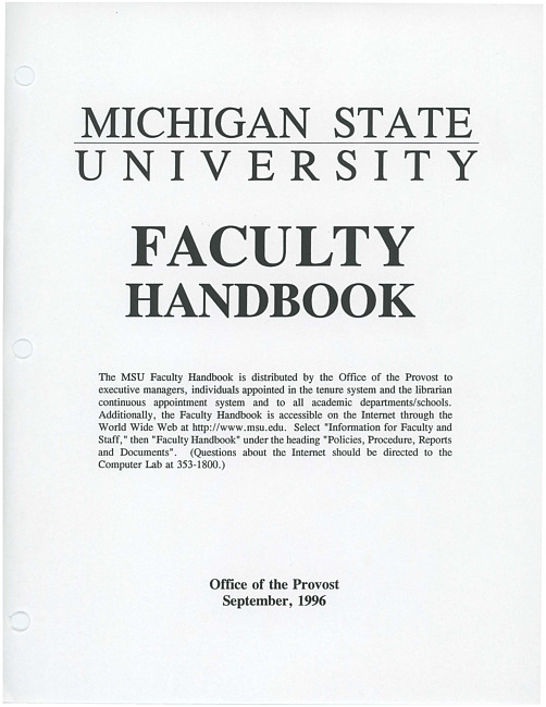 Faculty handbook for the 1996 academic year. Includes information regarding organization, university policies, academic personnel policies, instruction, research and creative endeavor, and faculty and academic staff retirement and benefit programs.
