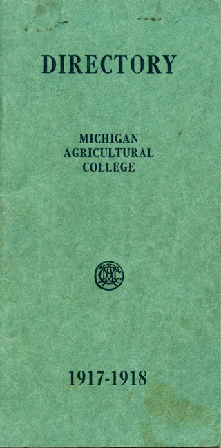 The 1917-1918 Michigan Agricultural College directory contains listings for faculty and students. Information for faculty includes name, position, office address, and residential address. Information for students includes name, local address, major, and year in school. The directory also contains a list of dormitories, list of departments with staff names, and a street directory.