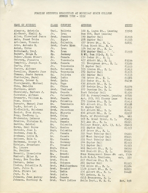 Foreign students registered at Michigan State College. (Summer term 1952)