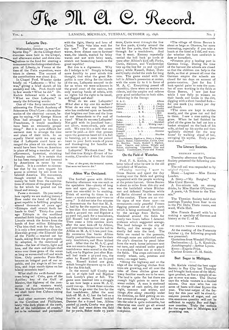 Major articles in this issue include: Lafayette Day -- Albion Was Outclassed -- On the Field of Waterloo -- The Literary Societies -- Beet Sugar in Michigan -- Official Directory -- The Use of Higher Education -- A Jumping Gall -- Alumni of M.A.C., Attention -- An Incident in the Literary Career of Julius Caesar -- At the College -- The Convenanters of Scotland -- News from Graduates and Students -- How We Stand on Athletics
