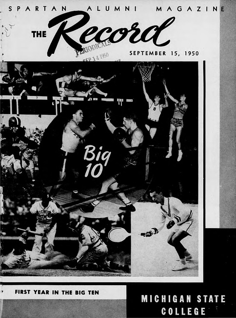 Major articles in this issue include: World-Famed Scientist Named Physics Head -- Fire Destroys MSC Quonset Cafeteria - Firemen, Students Stage Futile Hour-Long Battle -- October 14 Homecoming is Expected to Attract Over 10,000 Alumni -- Home Ec Invitation -- Field for Chapel Name is Narrowed to Three -- Lyman and Giltner, Former Deans of Veterinary Medicine, Succumb -- The Affairs of State -- On the Cover... -- New Home Demonstration Leader Named by MSC -- Continuing Education Service Reaches 106,000 in 1949-50 -- MSC Horticulture Lecture Series Will Honor Harry J. Eustace, '01 -- "Susie" Bares Stomach for Scientific Research -- New Ag Board Member -- MSC Students Approve Television of Sports -- R.E. Olds, Auto Pioneer, Friend of Michigan State, Dies August 26 -- Degrees Awarded 900 at End of Summer Term -- Kenneth M. Dunn, '42, Dies in Auto Accident -- Three Generations of MacKinnons Return to Campus for Alumni Day -- MSC Opens 1950 Football Season with September 23 Oregon State Tilt -- Homecoming October 14 -- Cross Country Opens Big Ten Competition -- Two Spartan Athletes Represent U.S. Abroad -- Coach "Pete" Newell Faces Tough First Year in Big Ten Basketball -- MSC's Weinacker is Nation's Top Walker -- Spartan Athletes Take Professional Positions -- Spartan-Notre Dame Game Sells Out August 3 -- Following Alumni Clubs -- Directory of MSC Alumni Clubs and President -- Days of Yore -- News About these Alumni -- Necrology... -- Norberg, Edgar and Conover Receive New Posts with Prominent Companies