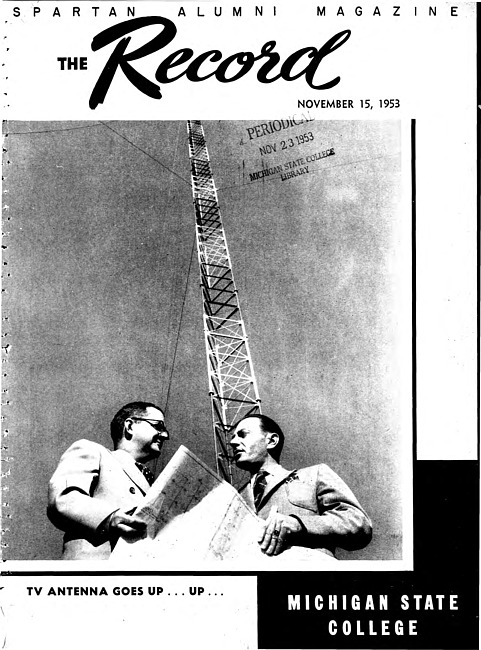 Major articles in this issue include: 1,034 ft. Tower Now Up -- Beaumont's Bells Ring Again for 14,419 -- State Board Approves Appointments and Grants in September Meeting -- Brazilian Business Ad School Set Up By MSC -- New Men's Dorm Opened as 1953-54 Year Begins -- Prof. Debunks Nazi Movement in Germany -- Freshman Named Future Farmers President -- Three Scholarships Set for Hotel Management -- 'Business Week' Cites Alum in 8-Page Story -- 'Branch Factories' May Aid Foreign Economies -- MSC Experience Helping Ryukyus University at Vital U.S. Outpost -- Cancer Study Progresses -- Affairs of State -- Prof. Card of Poultry Dept. Retires December 1 -- Two Art Professors Win National Recognition -- MSC Mourns Death of Dr. Lee M. Thurston -- Biography of Sen. Lodge Written by History Prof. -- Be it Resolved... -- MSC Faculty Achievements -- Toll Named Assistant Alumni Director -- Death Claims Four Members of MSC Family -- 'Accident' Leads to Discovery of New Dyes -- Spartan Sports -- Munn & Co. Take 'Em Just One at a Time -- Hopes High for Lift of Big Ten Probation -- Hoopsters Prepare for Tough Time in Big Ten -- Covering the Clubs -- News About these Alumni -- Necrology