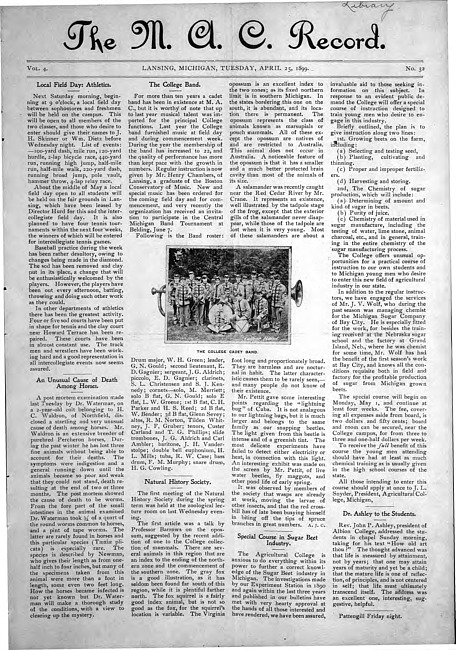 Major articles in this issue include: Local Field Day: Athletics -- An Unusual Cause of Death Among Horses -- The College Band -- Natural History Society -- Special Course in Sugar Beet Industry -- Dr. Ashley to the Students -- Why They Came -- Our Record in Intercollegiate Field Days -- How to Make College Life Successful -- At the College -- Our Societies -- News from Graduates and Students -- The Junior Hop -- College Appropriation Passed by Senate -- Our Second Nine Wins