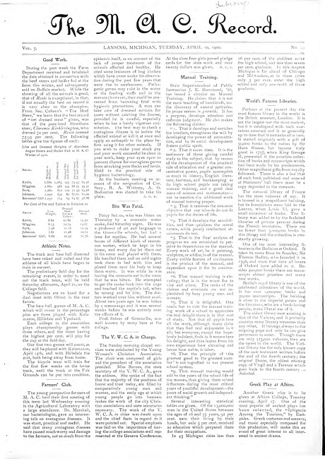 Major articles in this issue include: Good Work -- Athletic Notes -- Farmers' Club -- Bite Was Fatal -- The Y.M.C.A. in Charge -- Manual Training -- World's Famous Libraries -- Greek Play at Albion -- Michigan Oratorical League -- Rosa Bonheur Dead -- At College -- News from Graduates and Former Students