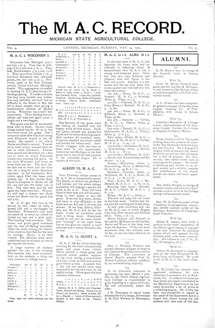 Major articles in this issue include: M.A.C. 3, Wisconsin 2 -- Albion vs. M.A.C. -- M.A.C. 14, Olivet 6 -- M.A.C. 56 1-2, Alma 28 1-2 -- Alumni -- Woman's Club Banquet -- Horticultural Club -- Here's to the M.A.C. Chorus! -- Concert -- Standing of Teams -- About the Campus -- Plowing by Steam in Michigan
