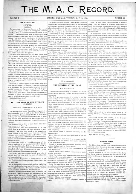 Major articles in this issue include: The Hessian Fly -- What Now Shall Be Done With Our Forests? -- The Education of the Indian -- Society Notes -- Hints to Contributors -- Summer Term Announcements -- News From Graduates and Students -- Program of Exercises at M.A.C. -- Vacation Ball Games -- At the College