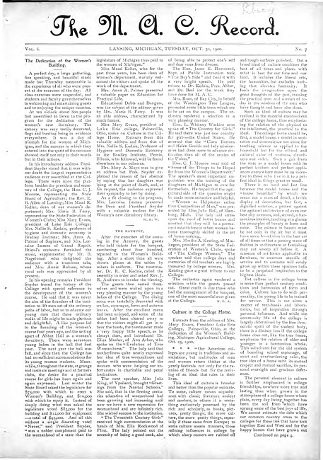 Major articles in this issue include: The Dedication of the Women's Building -- Culture in the College Home -- The American Queen -- State Board Meeting -- Athletics-Another Defeat -- From the Side-Lines