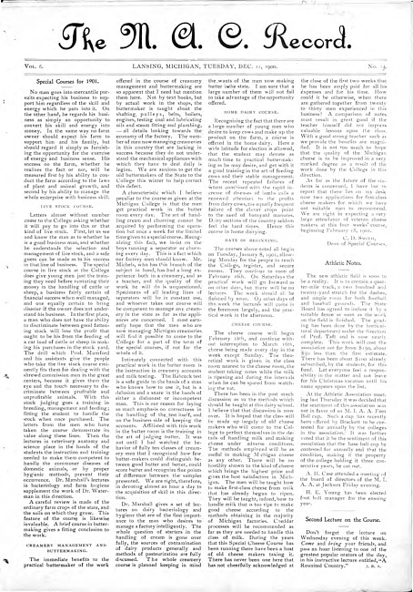 Major articles in this issue include: Special Courses for 1901 -- Athletic Notes -- Second Lecture on the Course -- The Character of Antigone -- Campus Notes -- Concerning Wheat Insects and Intestinal Worms in Lambs -- Former Students and Graduates -- Botanical Club