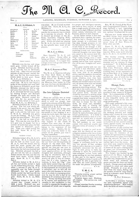 Major articles in this issue include: M.A.C. 22, Hillsdale, 0 -- M.A.C. at Albion -- M.A.C. Reserves at Flint -- Our Inter-Collegiate Oratorical Contests -- Y.M.C.A. -- Olympic Party -- The Days of Auld Lang Syne -- Botanical Club Meeting -- Class of 1905 -- Old Students -- Notes Gathered Here and There