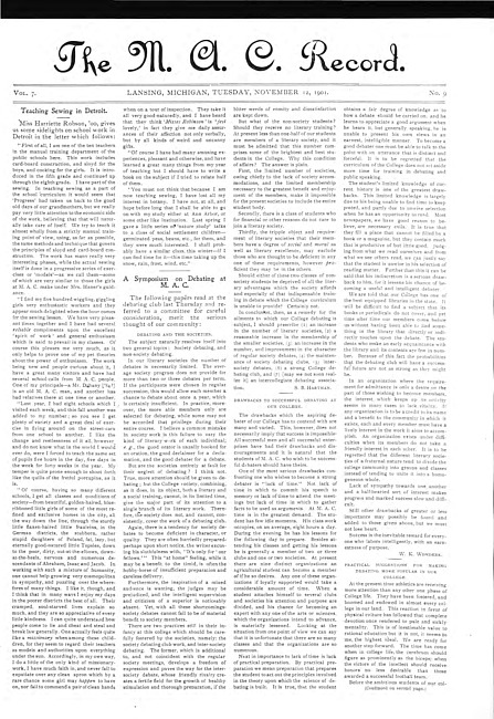 Major articles in this issue include: Teaching Sewing in Detroit -- A Symposium on Debating at M.A.C. -- The Problem of the Trusts -- M.A.C. Reserves vs. Charlotte High School -- Y.M.C.A. -- Questions for Debate in the M.A.C. Debating Club -- Old Students -- Notes Gathered Here and There -- Olympic Party