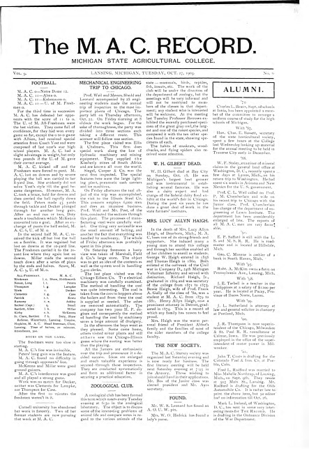Major articles in this issue include: Football -- Mechanical Engineering Trip to Chicago -- Zoological Club -- W. H. Gilbert Dead -- Mrs. Lucy Allyn Haigh -- The New Society -- Found -- Alumni -- Hort. Club -- Y.M.C.A. -- Memorial Resolutions -- Alumni -- About the Campus