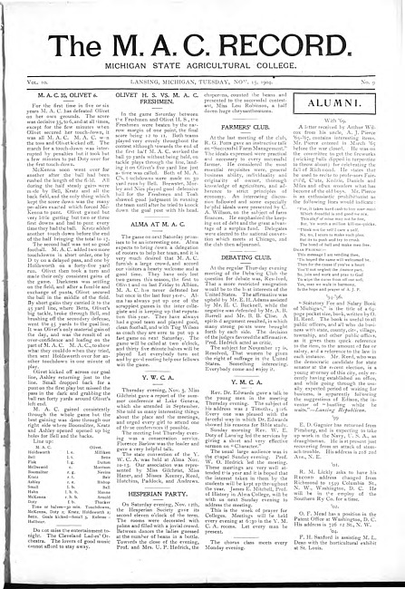Major articles in this issue include: M.A.C. 35, Olivet 6 -- Olivet H.S. vs. M.A.C. Freshman -- Alma at M.A.C. -- Y.W.C.A. -- Hesperian Party -- Farmers' Club -- Debating Club -- Y.M.C.A. -- Alumni -- Sororian Party -- Hort. Club -- About the Campus -- New Books in the Library