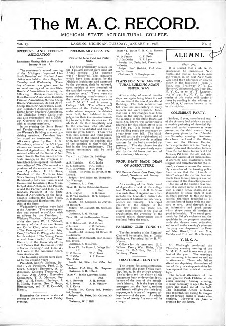 Major articles in this issue include: Breeders and Feeders' Association -- Preliminary Debates -- Plans for New Agricultural Building Again Under Way -- Prof. Shaw Made Dean of Agriculture -- Farmers' Club Tonight -- Oratorical Contest -- Alumni -- Columbian party -- Y.M.C.A. -- Short Course Students -- Debating Club -- Hort. Club -- Roster of Corps of Cadets, Michigan Agricultural College -- About the Campus -- Basketball -- Inter-Class Basketball Schedule