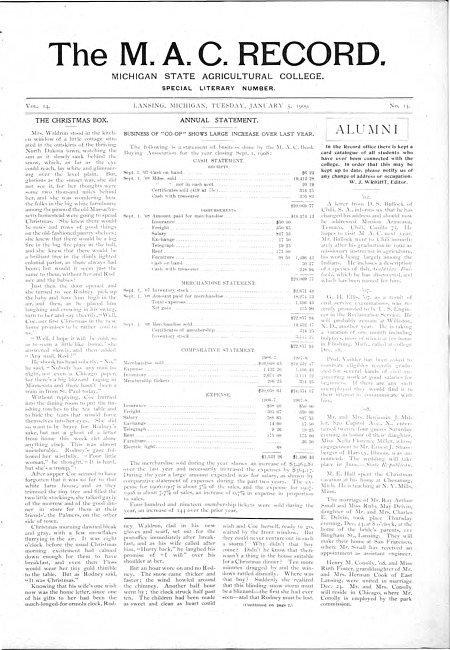 Major articles in this issue include: The Christmas Box -- Annual Statement -- Alumni -- The Spirit of Larceny -- The Lost Watch Charm -- Jerry's Reward -- When a Cooking Demonstrator was Appreciated -- The Iniquity of the Fathers -- About the Campus -- Eighteenth Annual Meeting -- Society Officers -- Mr. Smith (Article continues in vol.14, no.15, January 12, 1909)