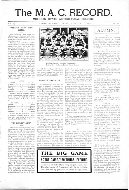Major articles in this issue include: Varsity Wins Both Games -- The Poultry Show -- Horticultural Club -- The Big Game-Notre Dame -- Alumni -- Pratical Forestry Work All the Time -- The Profession of Engineering (Article continues in vol.15, no.21, February 22, 1910) -- About the Campus -- Notice -- How Students Board at M.A.C. -- Corn Growers Here -- Sororian -- Forensic-Delphic -- Y.M.C.A. Notes