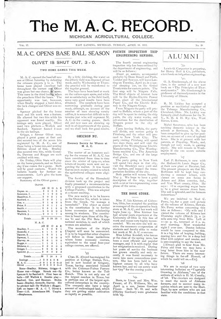Major articles in this issue include: M.A.C. Opens Baseball Season -- Omicron Nu -- Fourth Inspection Trip Engineering Seniors -- The Book Store -- Alumni -- Michigan Weeds -- Eunomian Prize -- Hort. Club -- Railroad Taxation in Michigan -- Michigan Academy of Science -- About the Campus