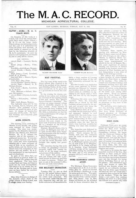 Major articles in this issue include: Olivet - Alma - M.A.C. Track Meet -- Alam Debate -- May Festival -- The Military Inspection -- Home Economics Association -- Hort. Club -- New Veterinary Building -- U. of M. An Easy Victim -- Wabash Defeated -- Capt. Ireland and the U.S. Army (Article continued from vol.17, no.32, May 14, 1912) -- About the Campus