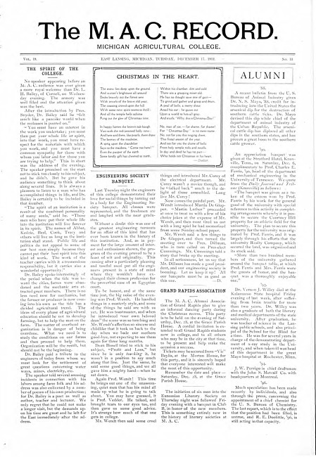Major articles in this issue include: The Spirit of the College -- Christmas in the Heart -- Engineering Society Banquet -- Grand Rapids Association -- Alumni -- Bible Study Banquet -- Farmers' Club Banquet -- Beekeepers' Association -- Forestry Club Banquet -- Civil Service Examination - P.O. Clerk -- Michigan Bird Life -- About the Campus -- New Books in Library -- Teaching Positions in Philippine Islands
