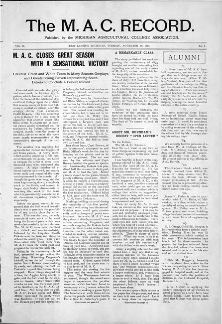 Major articles in this issue include: M.A.C. Closes Great Season with a Sensational Victory -- A Remarkable Class -- About Mr. Burnham's Recent "Open Letter" -- Alumni -- Addresses Wanted -- Whom Do You Know? -- A Crying Need -- A Correction -- Dr. W.W. Tracy, '67, Pays Visit to the College -- Hort. Club -- Reunions - Annual or ? -- Hulse Gets County Job -- "Carp" Julian to Lead M.A.C. Next Season -- Y.M.C.A. Headliners