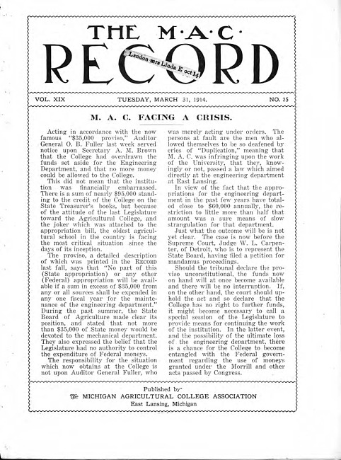 The M.A.C. record. Vol. 19 no. 25 (1914 March 31)