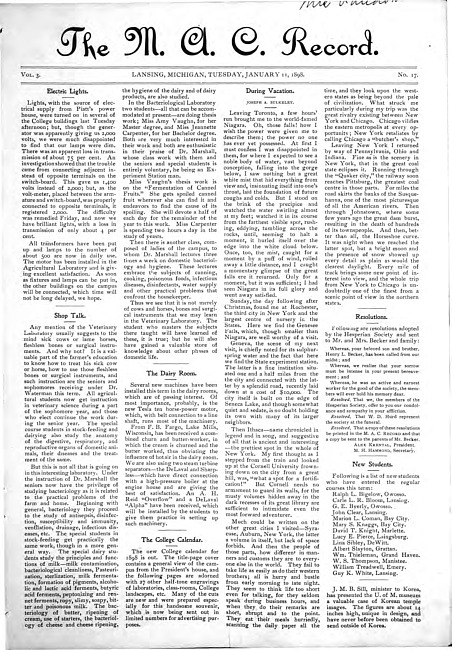 Major articles in this issue include: Electric Lights -- Shop Talk -- The Dairy Room -- The College Calendar -- During Vacation -- Resolutions -- New Students -- Official Directory -- Changes in Sunday Services -- Will you be a "Do-as-dad-did" Farmer? -- Our Generator and Motor -- Is the Invention of Modern Machinery Detrimental to Laboring Classes -- At the College -- Old Times Come Back -- News from Graduates and Students