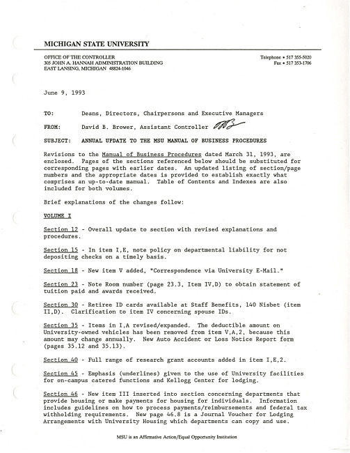MSU Manual of Business Procedures (MBP) from 1993. The MSU MBP is coordinated by the Office of the Controller to provide information regarding proper University business procedures and fiscal oversight. Please visit the Office of the Controller's website for the most current and up-to-date MBP, https://ctlr.msu.edu/manual-of-business-procedures.
