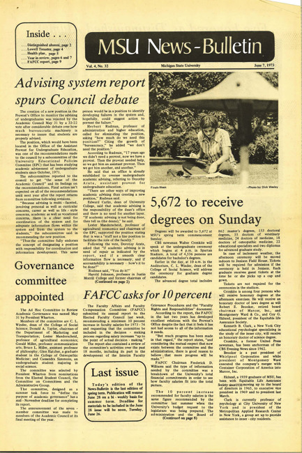 Main Topics in this Issue Include: Advising system report spurs Council debate -- 5,672 to receive degrees on Sunday -- Governance committee appointed -- FAFCC asks for 10 percent -- Five honored as 'Distinguished Alumni' -- Women's Advisory Council studying tenure, other areas -- Dorm increase of $25 recommended by Thorburn -- Recycled paper -- Neighborhood rejuvenation studied by class -- Physicists to meet -- 265 credit courses offered off campus -- Weak housing laws blamed -- MSU's 'official spokesman' retires -- CUD curriculum approved -- Health care extended to students' families -- First MSU DO's graduate Sunday -- School mergers urged to achieve integration -- 1972-73 A Review -- Basics of nursing enforced in program -- Cultural identity sought by African blacks too -- Energy crisis may pit big powers against have-nots, Nellor says -- MSU economist sees dollar near true value -- Columbia gives medal to MSU visiting prof -- Evening College motivations vary -- State heading for tragic year -- Calendar of Events