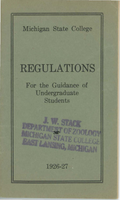 Regulations for the guidance of undergraduate students for the 1926-1927 academic year. Includes information regarding registration, course requirements, fees, examinations, grades, requirements for graduation, absences, withdrawal from college, the library, athletics, military training, the band, student council, student organizations, social gatherings, employment, health services, and student publications. Also includes college calendar.