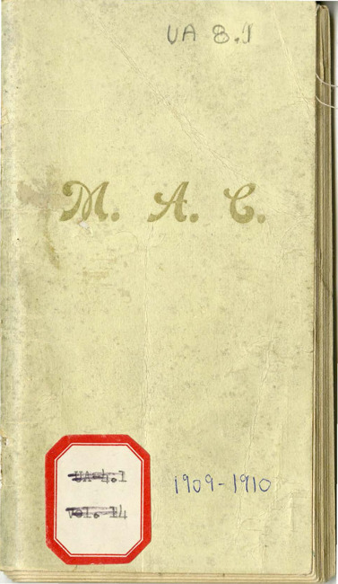 Student handbook from the 1909-1910 academic year. Includes academic calendar, tips for new students, football schedule, football songs and yells, MAC athletic records, and church directory. Also includes information regarding the YWCA and YMCA, college organizations, and athletics.