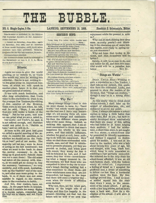 Headlines in this issue: Editorial -- Senior's Song -- Why Not? -- "Things are Workin'" -- A Ballad -- How they do It by Judas -- A Parody by Jinks -- The Social -- Popping the Question -- A Model Letter -- Rats -- The Future