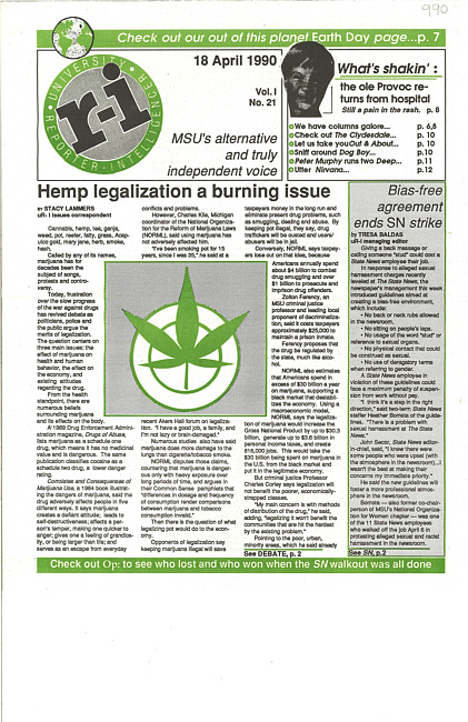 Major stories: Hemp Legalization -- State News Strike Ends -- Local Drug War -- Editorials -- Viewer Mail -- Out and About -- Reviews - Peter Murphy "Deep", the Latin Quarter venue -- Entertainment - Tad, Nirvana, Victim's Family at The Blind Pig