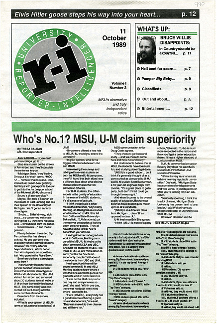 Major stories: U-M vs MSU, Who's No. 1 -- Coming Out Day -- Editorials -- Classifieds -- Out and About -- Reviews - "In Country", Laughing Hyenas -- Entertainment - Elvis Hitler, "Loaded Down With Calm: The Saga of Taft"