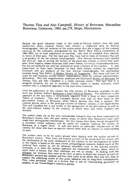 Review of: Thomas Tlou & Alec Campbell. History of Botswana. Gaborone, Botswana: Macmillan Botswana, 1984