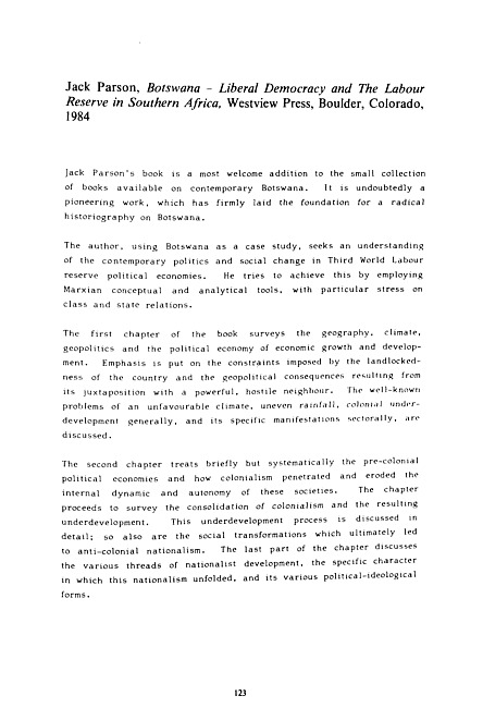 Review of: Jack Parson. Botswana: liberal democract and the laboour reserve in Southern Africa. Boulder, CO: Westview Press, 1984