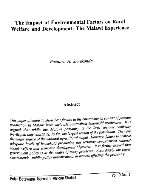 The impact of environmental factors on rural welfare and development : the Malawi experience