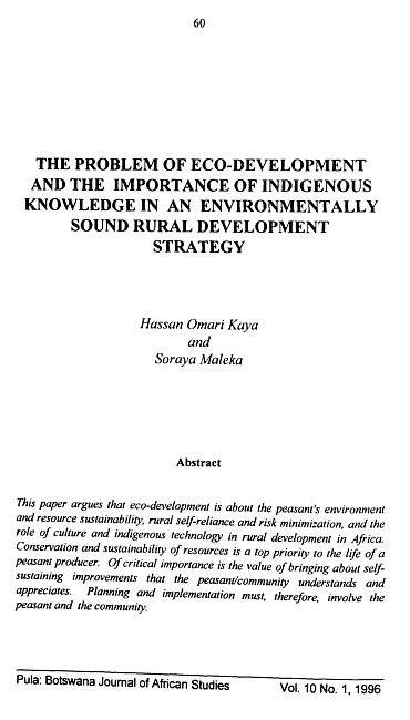 This paper argues that eco-development is about the peasant's environment and resource sustainability, rural self-reliance and risk minimization, and the role of culture and indigenous technology in rural development in Africa. Conservation and sustainability of resources is a top priority to the life of a peasant producer. Of critical importance is the value of bringing about selfsustaining improvements that the peasant/community understands and appreciates. Planning and implementation must, therefore, involve the peasant and the community.