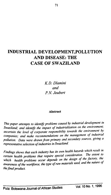 This paper attempts to identify problems caused by industrial development in Swaziland; and identify the impact of industrialization on the environment; ascertain the level of corporate responsibility towards the environment by companies; and make recommendations on the management of industrial pollution. Data were drawn from primary and secondary sources, giving a representative selection of industries in Swaziland Findings shows that each industry has its own health hazards which result in certain health problems that require special consideration. The extent to which health problems occur depends on the design of the factory, the awareness of the workforce, the type of raw materials used, and the nature of the final product.